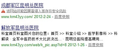 六、网站安全检测工具:百度会定期自动检测网站并提供结果查询,帮助您及时发现并定位自己网站的安全隐患。如果您在百度搜索结果中发现自己的网站带有“该网站可能因黑客侵入而存在安全风险”的提示,如下图中: